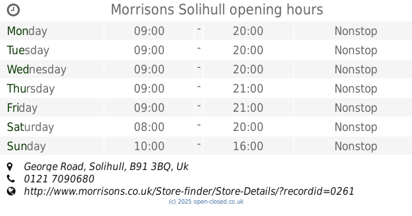 It is also possible to : Edit these OPENING HOURS of Pharmacy Morrisons In Solihull, George Road,